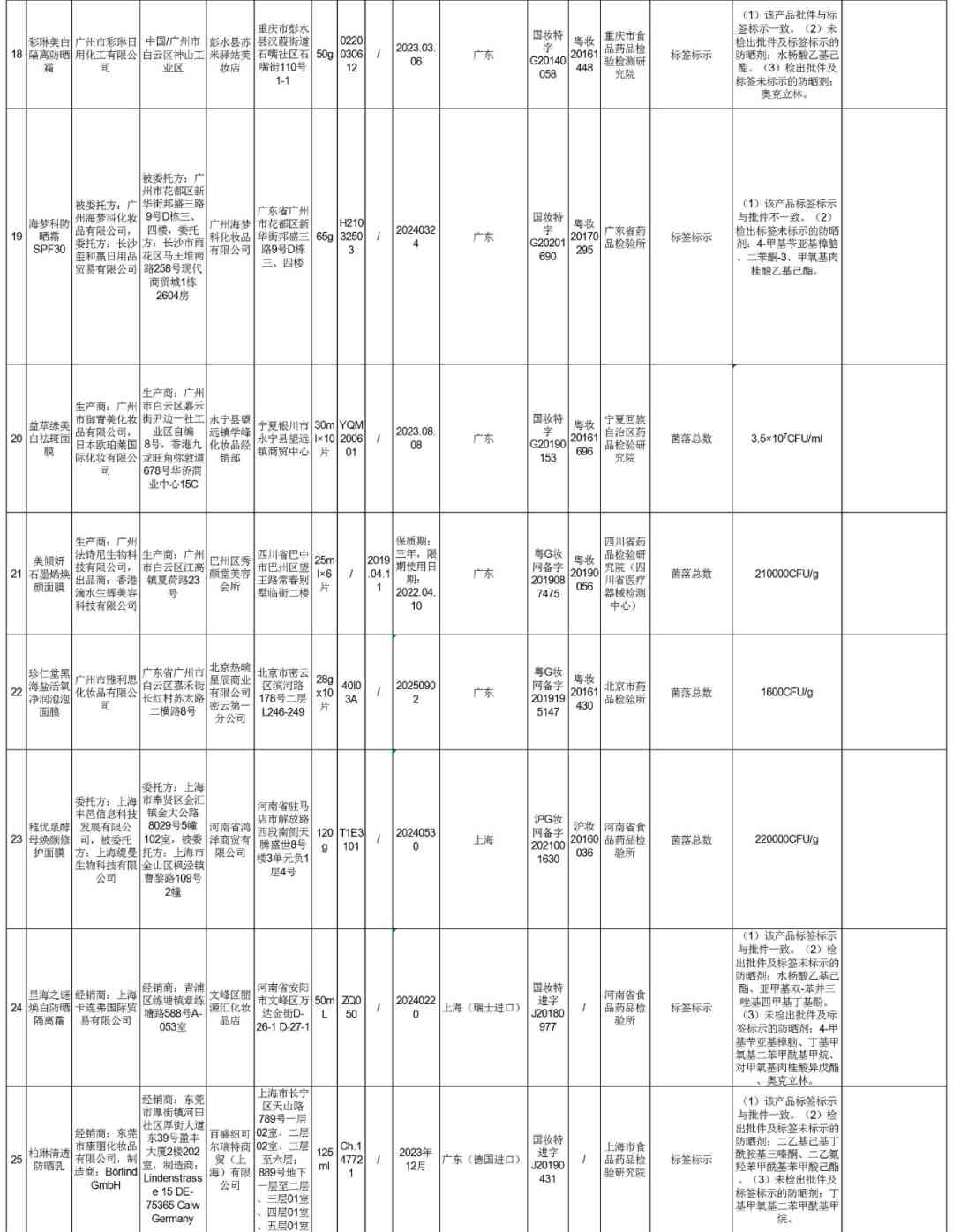 在国家药监局的通告中,50批次化妆品不合格,其中主要违规问题包括所含成分超标、产品标签标示一致等等。