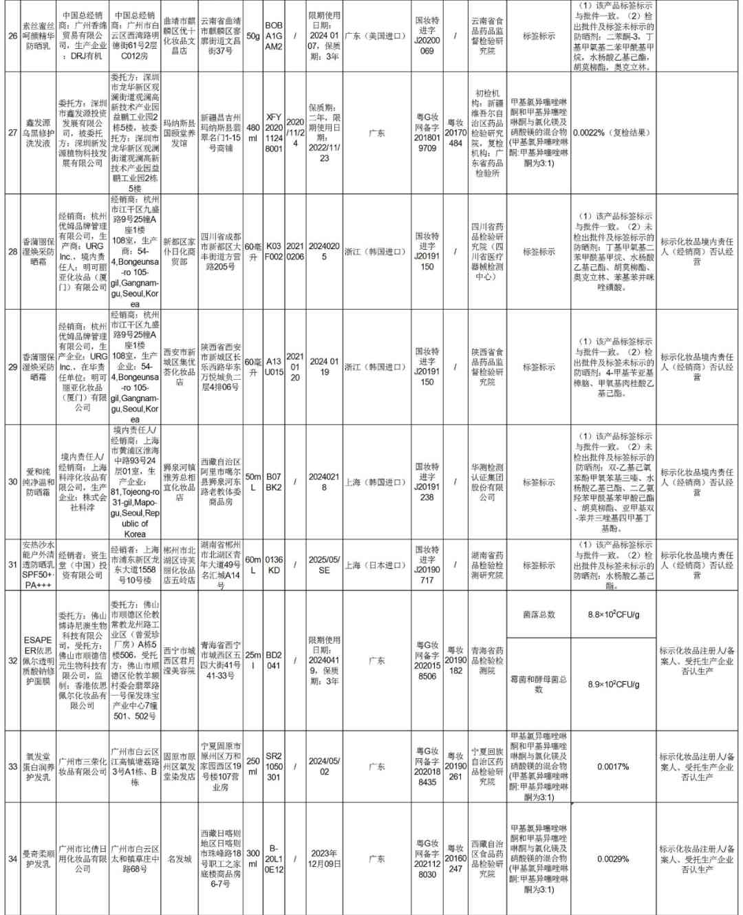 防晒类产品的不合格主要是产品批件与标签标示一致,在多个产品的检测中,未检出批件及标签标示的防晒剂和检出批件及标签未标示的防晒剂。如里海之谜焕白防晒隔离霜,检出批件及标签未标示的防晒剂:水杨酸乙基己酯、亚甲基双-苯并三唑基四甲基丁基酚,却未检出批件及标签标示的防晒剂:4-甲基苄亚基樟脑、丁基甲氧基二苯甲酰基甲烷、对甲氧基肉桂酸异戊酯、奥克立林等。