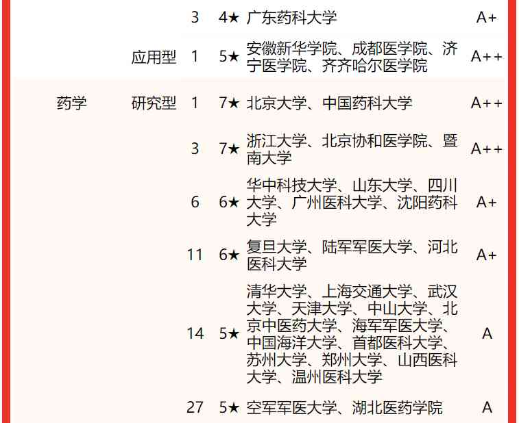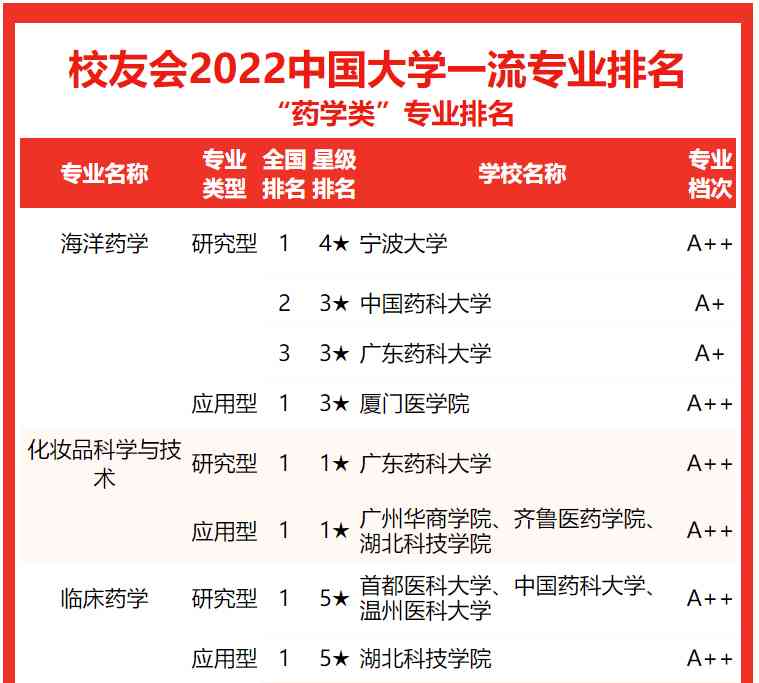 在“药学专业排名(研究型)”中,北京大学、中国药科大学获评中国七星级专业(7★),跻身世界知名高水平专业、中国顶尖专业行列,问鼎校友会2022中国大学药学专业排名(研究型)首位。