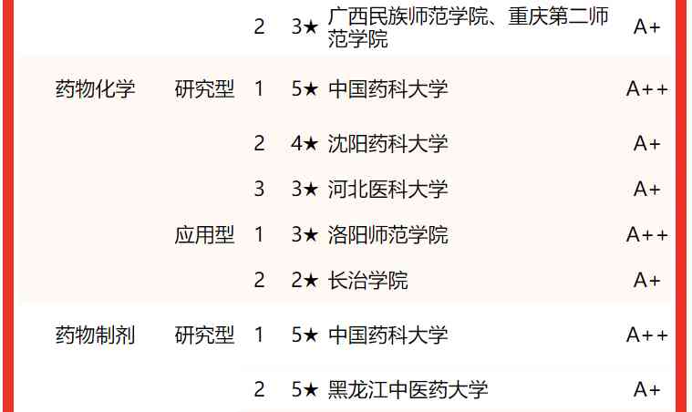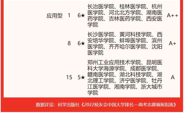 在“药物制剂专业排名(应用型)”中, 齐齐哈尔医学院、济宁医学院、成都医学院、安徽新华学院荣膺中国五星级应用型专业(5★),进入中国一流应用型专业行列,,位列校友会2022中国大学药物制剂专业排名(应用型)首位。