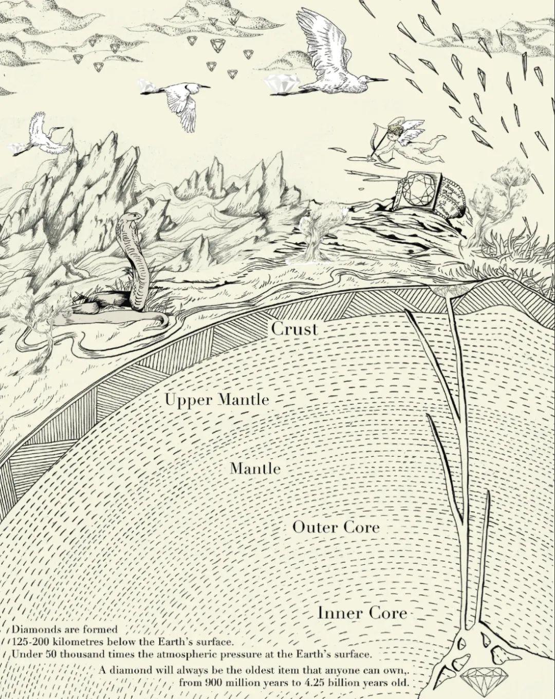 宝石学家们发现,粉钻的颜色并非因为化学的原因致色,而是因为钻石内部碳原子的错位。天然钻石在地核中受到高温压力的影响,发生晶格扭曲,导致碳原子结构发生的变化。而要知道,晶格扭曲的几率可是非常少见的,粉钻就是这么神奇的存在。