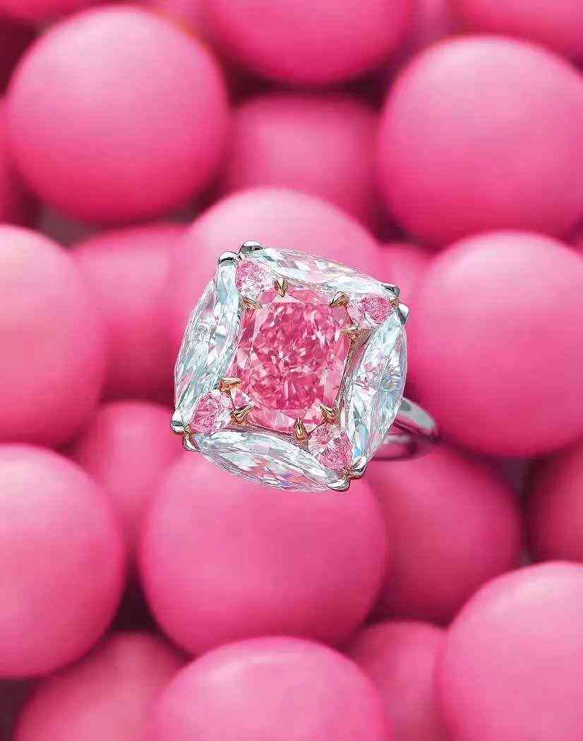 以大克拉收藏闻名于珠宝圈的珠宝商 Moussaieff 穆萨耶夫对稀有粉钻也是爱到不行,它在 2019 年 5 月香港佳士得拍卖中带来的“粉色泡泡糖”戒指给大家留下了深刻的印象,虽然主石只有 3.44 克拉,但这件作品从品质到设计,再到独特命名,无疑又让稀有粉钻成为大众关注的焦点!