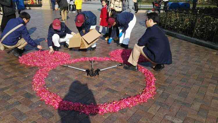 正好看到工作人员在铺洒玫瑰花瓣,那些新鲜的花瓣似乎还含着朝露。它们被小心地造型成米奇头的图案,给节日中的乐园平添了几分浪漫。