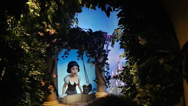 接下来就是马不停蹄地排队,时间那么紧张,连停下来好好吃个中饭的时间都没有。最热门的飞跃地平线永远都是要等待3小时以上。除了最长的七个小矮人过山车排了150分钟以外,我们还见缝插针地玩了晶彩奇航、沉落宝藏、漫游童话世界、疯帽子茶会迷宫和冰雪奇缘欢唱会等。好在迪斯尼的每个游戏都以童话电影为依托,再加上精良的制作和炫目的场景,带来的心理体验绝对会超越预期的。