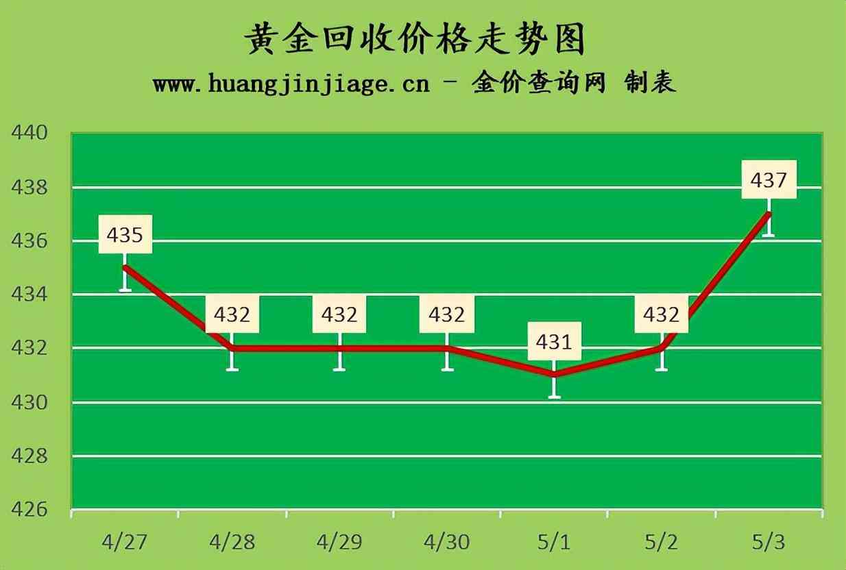 黄金回收价格437元/克,铂金回收价格203元/克,钯金回收价格297元/克,18K金回收价格312元/克,银条回收价格4.4元/克。(黄金行情是波动的,回收金价没有固定标准。)