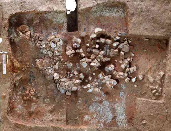 凌家滩遗址岗地东南角、内壕中部,以大面积的红烧土堆积为特点。此次揭露发掘,初步认为大型红烧土遗迹年代为凌家滩文化最繁盛的时期(距今5500—5350年)。红烧土分布范围平面呈长方形,南北长88米,东西宽40米,边界较直,东北角被明清堆积破坏,现存面积约2700平方米,复原总面积约3400平方米。