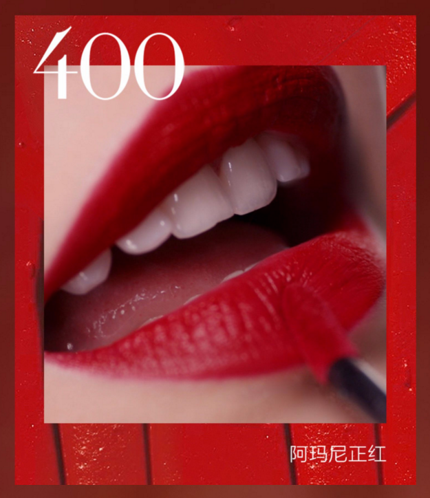 1)蓝调正红色#400这支色号官方叫“亚曼尼定制服”,光听名字就很高级。经典的复古蓝调正红色,涂上气场全开,女明星们走红毯都pick的色号。