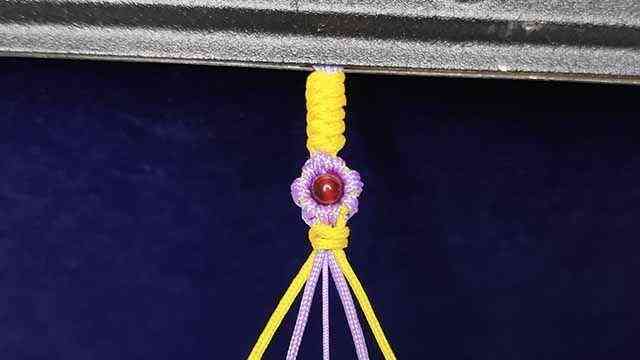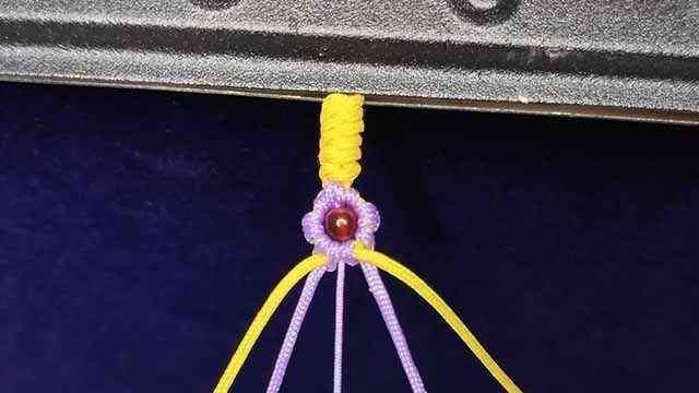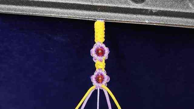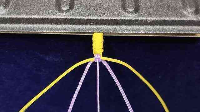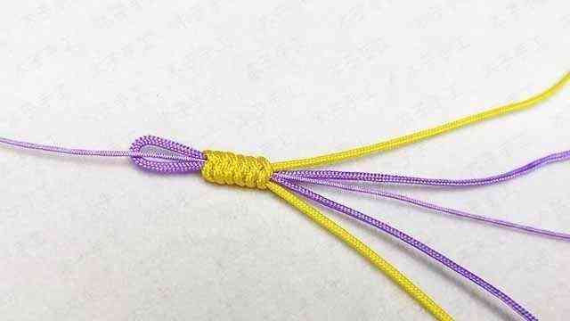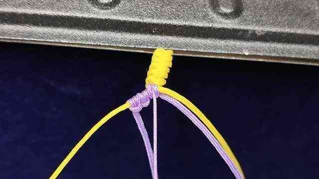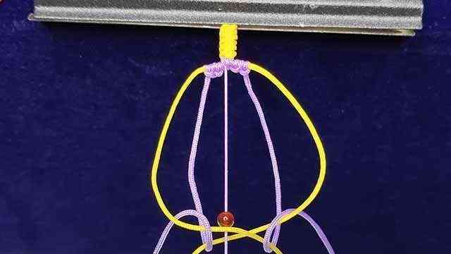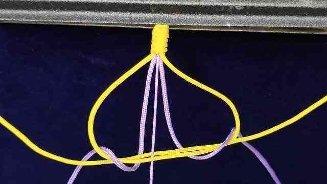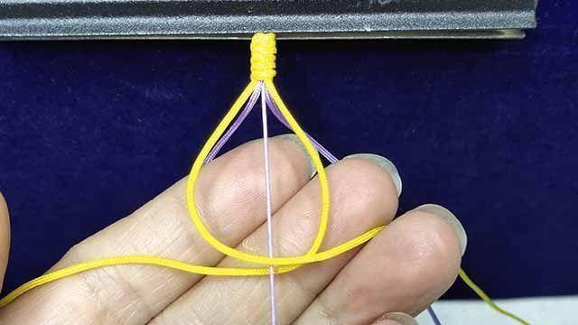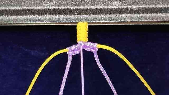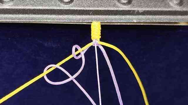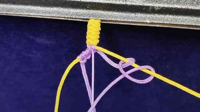 6、左边两根线,浅紫色线在黄色线上如图绕两次,这是往右做的雀头结