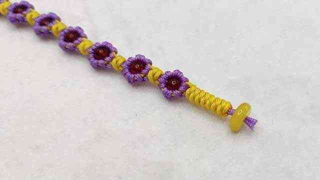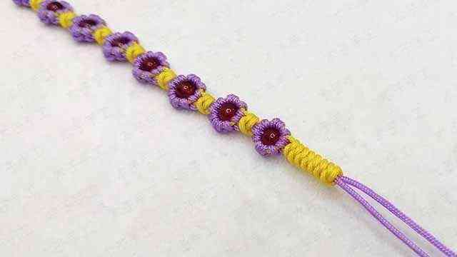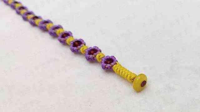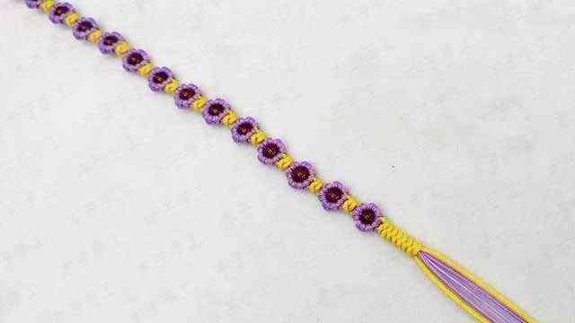 12、黄色线再次包住3根浅紫色线做一组夹心金刚结