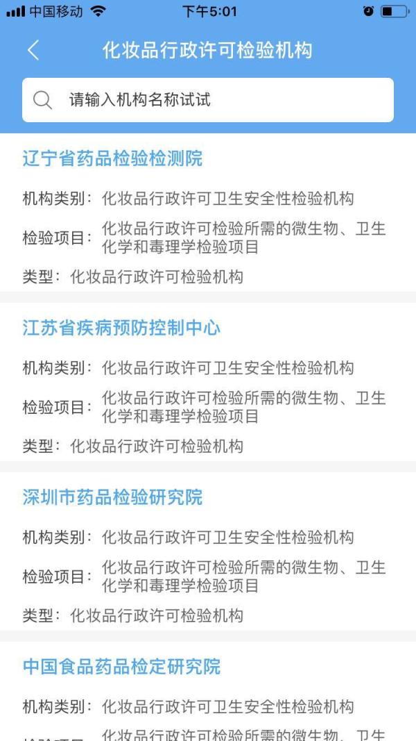 该APP上还具有查询化妆品行政许可检验机构的功能,消费者能在有需要的时候查询到机构名称、地址、联系方式和检验项目。此外,相关法规文件、监管动态、公告通告等信息也一应俱全。
