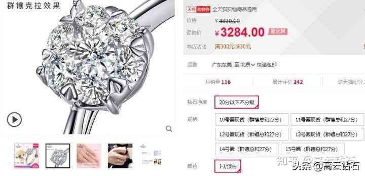 上面这个旗舰店的详情页,可以说是集电商各种坑于一体了:左侧钻石是PS的,比D色还亮呢;钻石重量用总重量表示,含糊其辞;以20分以下不分级来掩盖净度低的事实;