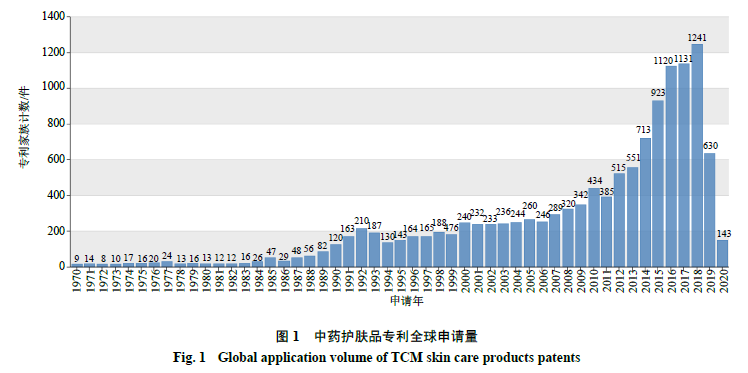 近年来,中药护肤品也在向产品转化发展。林小红[6]发明了一种中药滋润型护肤品并申请了专利;朱志辉[7]发明了一种具有补水、保湿、滋润控油、抗皱、晒后修复等作用的一种用中药提取物制成的护肤品及其制备方法并申请了专利。而目前国内对中药护肤品相关专利申请情况的统计和研究并不多,对中药护肤品的市场前景未有全面分析,因此,本研究将以中药护肤品为检索主题,透过专利文献公开的内容,从全球专利视角对中药护肤品的技术发展情况进行详细分析,并着重对近5年中药护肤品相关专利申请的国家(地区)分布、时间以及主要申请人分布进行分析,并且对技术进行分支、聚类分析,为中药护肤品的市场前景、研究方向提供导向及参考,为中医药多元化发展提供思路。