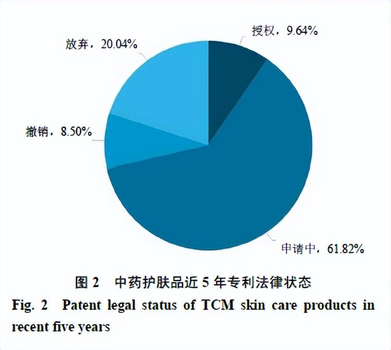 中药护肤品近5年的专利申请中,处于专利申请中的专利占61.82%,已授权的专利占9.64%,2种法律状态的专利申请数量占比超过70%,放弃的专利占20.04%,超过已授权专利数量,撤销的专利占8.50%(图2)。综合以上数据分析,由于近5年中药护肤品技术高速发展,技术的更新换代速度加快,专利权人更合理地进行知识产权保护,及时放弃老旧技术,积极创新,同时也存在一些创新程度不高的技术,未能获得专利授权。