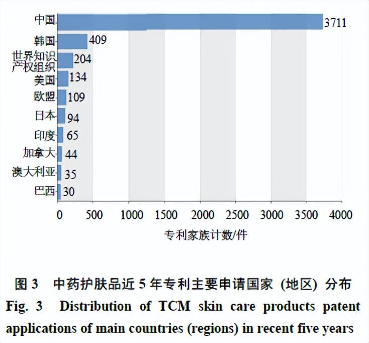 中药护肤品近5年专利申请国家(地区)主要为中国,其次为韩国、美国、欧盟、日本及印度(图3)。药妆等保健功能的护肤品在全球有着广泛的应用基础,其中,中药作为保健产品在中国发展历史悠久、接受度好,也是中药保健产品在全球的最大市场,中药护肤品技术近5年在中国的专利申请达到3711件。此外,在亚洲其他国家、欧洲、美洲均有一定的技术活跃度,其中,韩国申请409件,美国申请134件,欧盟申请109件,日本申请94件,印度申请65件,尤其近年来日本、韩国、美国、欧盟等国家(地区)的药妆产业发展迅速,产品成熟度高,品牌效应显著,产品传播度广,深受全球消费者的青睐,因此,该领域技术开发时也应着重关注以上国家(地区)的技术动态。