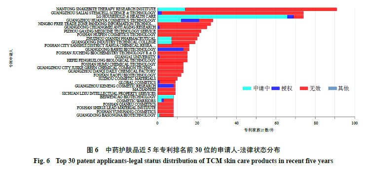 作为技术创新的主体以及相关技术的专利申请人,为保护其研发技术所开展的专利布局除了应考虑技术分布情况和市场布局区域,还要关注本领域重要申请人的专利布局情况。中药护肤品技术申请量排名前30位的大部分为中国申请人(图5、6),说明近5年在这一技术领域中国申请人处于绝对优势地位,其次是韩国申请人,此外,申请人还分布于美国、欧盟、日本、加拿大和澳大利亚,申请人主体性质为企业、科研院校和个人。