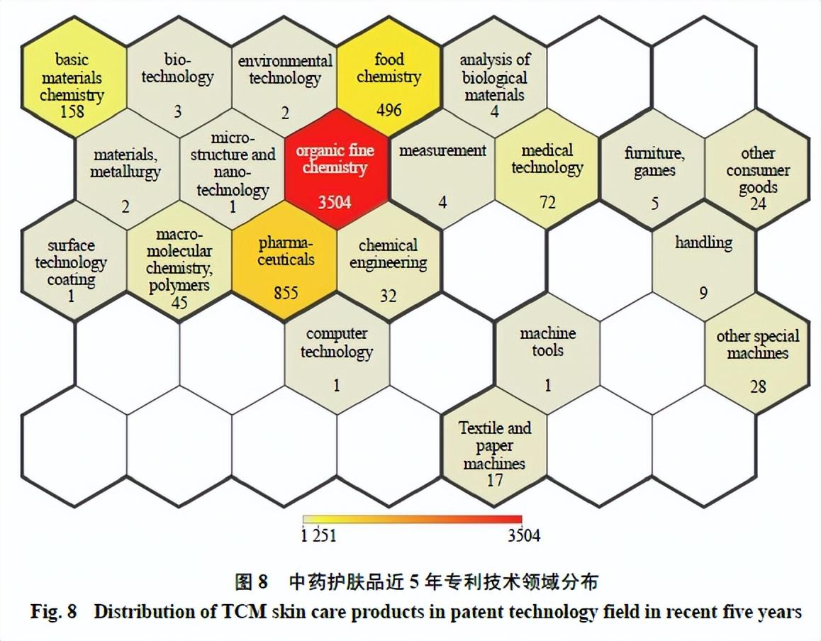本研究首先从整体角度,对中药护肤品相关专利的技术领域进行归类统计。根据Orbit数据库对相关专利技术领域的分类,中药护肤品近5年专利申请的技术领域主要分布于有机精细化学、制药、食品化学及基础材料化学领域,申请量分别为3504、855、496和158件(图8)。中药护肤品作为护肤品的1个分支技术,其热点技术领域依然为有机精细化学,但是中药的有效成分又赋予其一定的特殊功效,因此,出现了跨越多技术领域的现象,这说明在保持传统技术领域优势的前提下,该技术正趋向于多技术领域的发展趋势,赋予产品更多的功效也正是顺应了市场需求;同时,这也说明消费者对产品需求的多样化和功能化,因此,需要技术研发主体在多技术领域进行技术创新,市场潜力将更大。