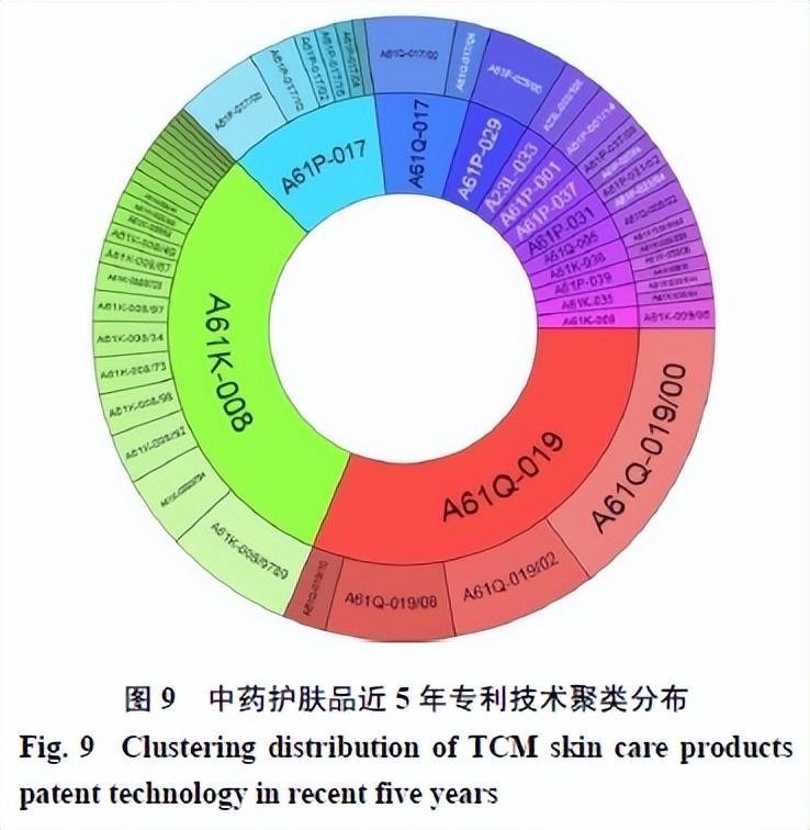 本研究针对中药护肤品相关专利分布在每个技术领域内的技术分支进行详细分类统计。中药护肤品近5年专利申请的技术聚类主要分布于A61Q-019、A61K-008、A61P-017和A61Q-017(图9),对应的技术聚类分别为护理皮肤的制剂、化妆品或类似的梳妆用配制品、治疗皮肤疾病的药物和隔离制剂,上述技术聚类对应的专利申请量占近5年专利申请总量的75%以上。其中,护理皮肤的制剂与化妆品或类似的梳妆用配制品为热点聚类,单个聚类占申请总量的30%左右,护肤、美容与妆容修饰也是中药护肤品的传统用途,在技术功效中占有主导地位,也是市场需求最大的技术聚类。