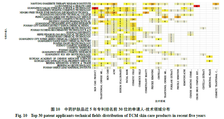 本研究对重要申请人技术构成进行详细分析,以全面了解重要申请人的技术动向。中药护肤品近5年专利申请量排名前30位的申请人申请专利的技术领域主要集中于护肤品、护肤、粉刺、透明质酸钠、面膜和化妆品(图10),此外,其他活跃的技术领域为中医药、美容、祛斑、祛粉刺、中药化妆品和原料药复合物提取物,分布的技术领域具有多样性。这说明中药护肤品的功能已不限于单一的护肤功能,目前已开发出各种功能的产品,为实现产品的各种功效从而衍生出各领域技术,正是日益多变的消费者需求与潜力无限的市场空间促进了该技术的蓬勃发展,为了在众多竞争者中脱颖而出,技术创新主体也越来越熟练地运用知识产权对相关技术进行保护,以延长产品的技术生命周期与法律生命周期。