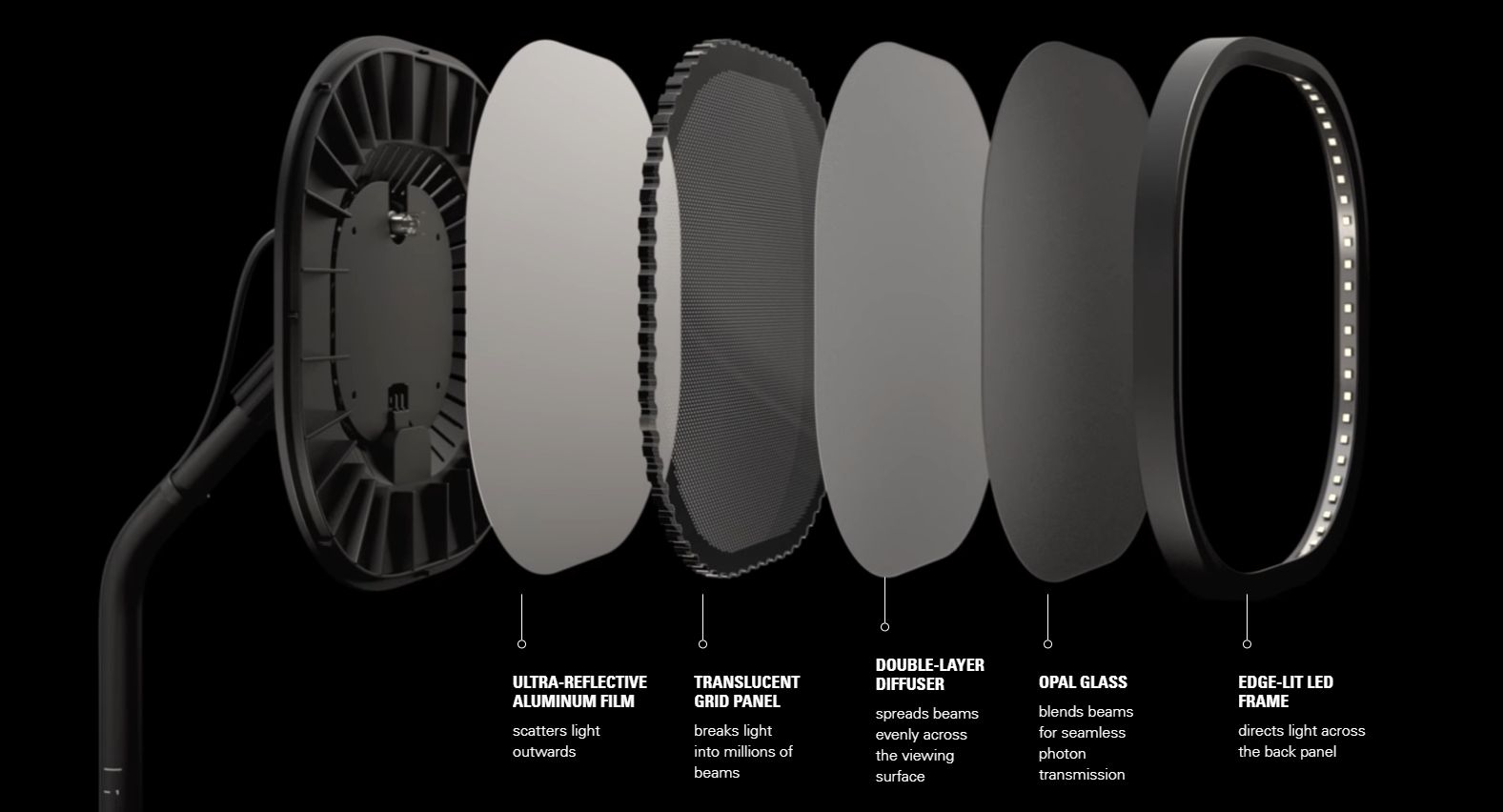 表面是压根看不出来这个灯内部有这么复杂的构造的,值得一提的是,LED 一圈围绕在了灯的四周,往中间发光,然后通过多层柔光,反射罩将柔和的灯反射出来。