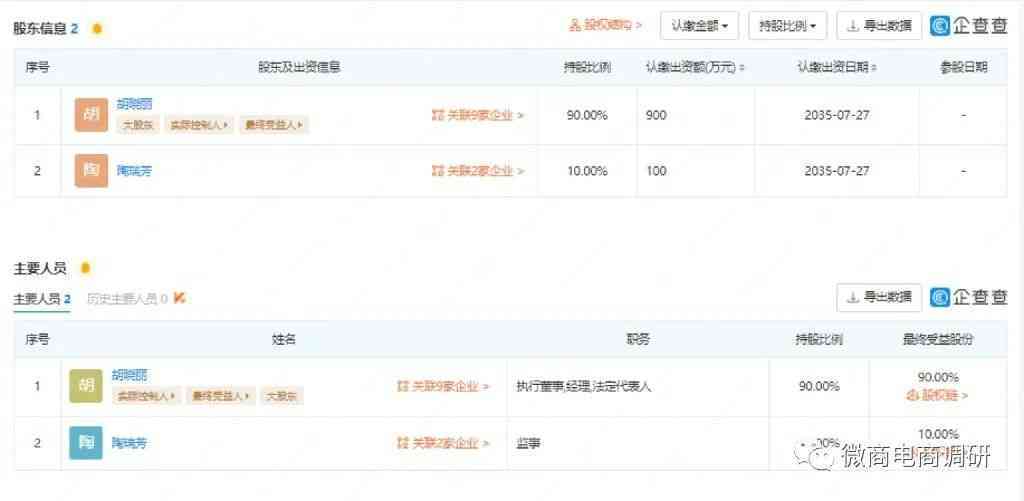 企查查APP显示,墨玉公主(北京)生物科技有限公司成立于2015年7月29日,注册地位于北京市通州区潞城镇胡郎路80号823室,注册资本为1000万元,实缴资本为0,法定代表人为胡晓丽。该公司由胡晓丽控股90%并担任执行董事兼总经理,陶瑞芳持股10%并担任监事。胡晓丽是该公司的实际控制人和最终受益人,同时也是墨玉公主的创始人。