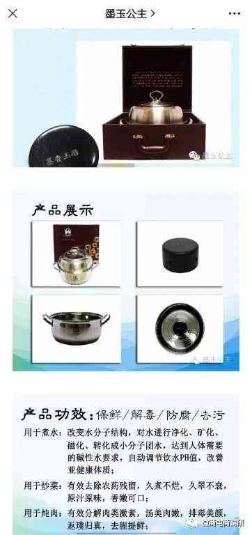 据宣传,墨玉保健锅、墨玉“食来运转”产品有保鲜、解毒、防腐、去污的功效,用于煮水可以改变水分子结构,对水进行净化、矿化、磁化、转化成小分子团水,达到人体需要的碱性水要求,自动调节饮水PH值,改善亚健康体质;用于炒菜可以有效去除农药残留,久煮不烂,久翠不衰,原汁原味,香嫩可口;用于炖肉可以有效分解肉类激素,汤美肉嫩,排毒美颜,返璞归真,去腥提鲜。