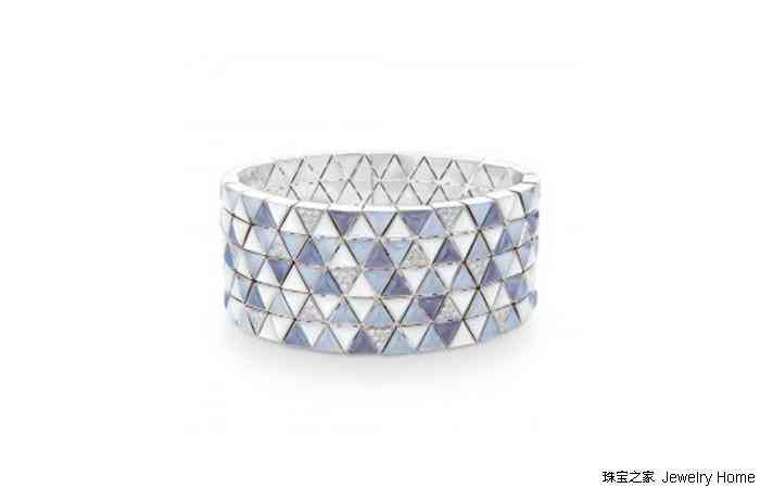 Boucheron 冬季帝国L’ANNEAU D’OR金环古城系列 MARQUETERIE 手镯,18K白金,无色钻石,蓝色玉髓,珍珠母贝,售价: 港币 1,610,000