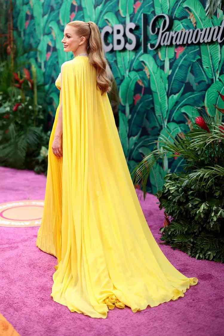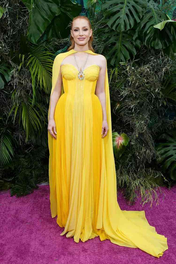 今年的黄色,具有一种明亮欢快的颜色,并且拥有鲜明活泼的特征,让穿上这个色彩的人都纷纷呈现出自信吸睛,魅力无限的气场,充满了温暖的正能量。就像好莱坞知名女星杰西卡·查斯坦(Jessica Chastain),在前不久出席 2023 年托尼奖红毯时,现年46岁的Jessica身穿一袭亮黄色抹胸长裙,有斗篷的样式,是来自Gucci 的拖地雪纺斗篷长裙,搭配银色翡翠红宝石项链,瞬间美成全场最吸睛耀眼的焦点。