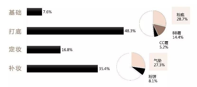 BB霜能这么火,主要还是靠韩国厂商对这一概念的美化和推广,声称加入了美白保湿舒缓隔离防晒等等护肤功能,既能遮瑕,又能护肤,还比传统的粉底液更加自然,这概念一经引入,一下子就成了当年的网红单品,成了传统粉底液有力的替代品。下图是2017年底妆品类检索份额分布图,可以看到BB霜的检索份额差不多达到了粉底检索份额的一半。很多消费者表明BB霜是其使用的个彩妆产品。