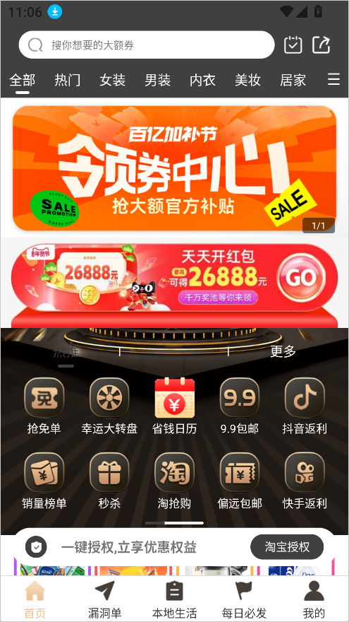 1、在本站下载安装软件,在首页中可以看到有很多的优惠福利,抢免单、幸运大转盘、9.9包邮、抖音返利等;