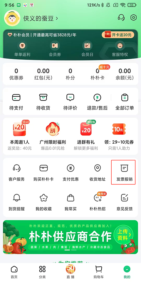 1、在平台中选择底部“我的”,在我od里面找到“发票报销”;
