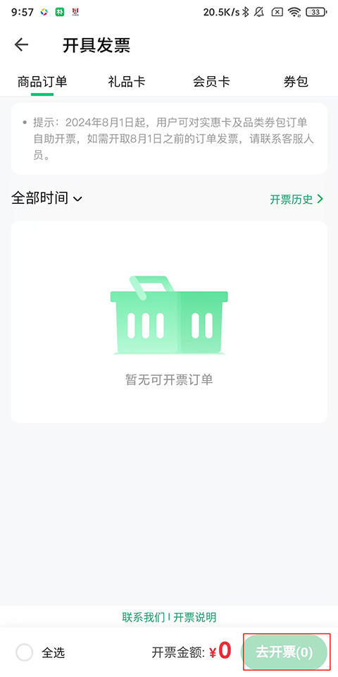 2、选择自己购买的物品,然后点击“去开票”;