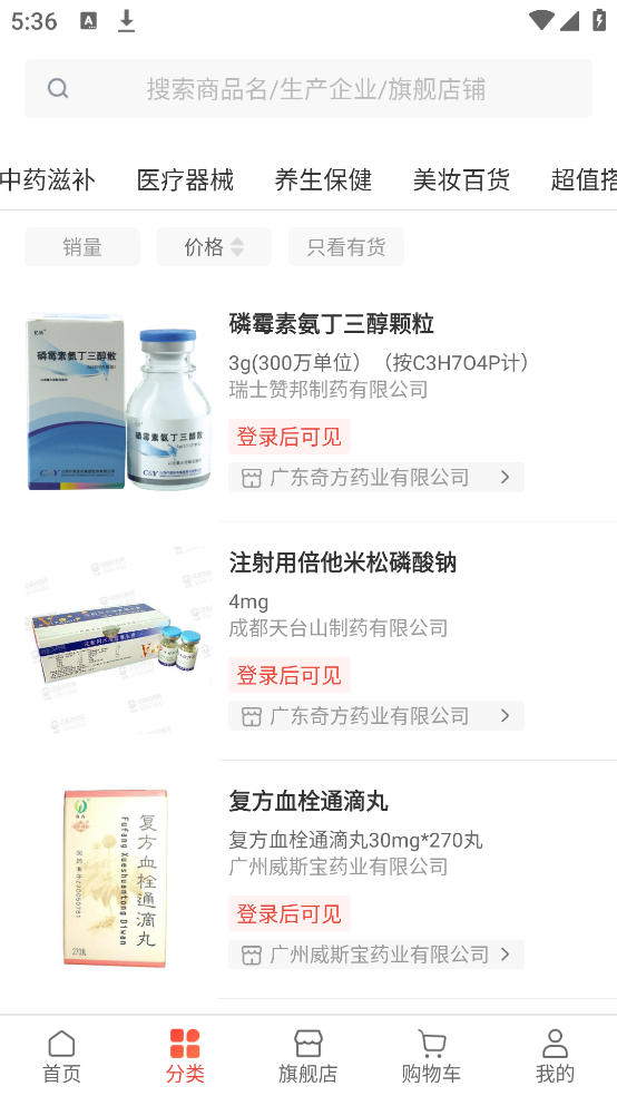 1、注册账号登录平台,选择需要购买的药品或者器械,也可以搜索商品名、生产企业、店铺等进行查找;