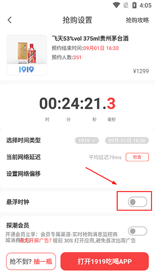 3、在抢购设置中,提供悬浮时钟功能,在手机桌面会提醒用户抢购的时间;