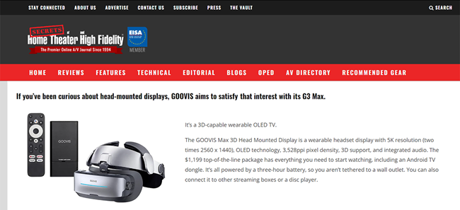 美国专业影音评测平台Secrets of Home Theater and High Fidelit对GOOVIS旗舰产品——GOOVIS G3 Max的IMAX级观影视效、良好私密性以及让人惊艳的画质表现大为赞赏:“GOOVIS G3 Max 3D头戴式显示器是我见过最酷的产品之一。作为一名画质发烧友,它是个人观影的极佳选择。相比传统投影仪,它能呈现更锐利的画面和更宽广的视野,是我在家用的其他设备难以企及的。”