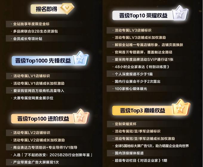 2025大赛全面焕新,围绕“营收成长”与“品牌打造”双轮驱动,通过更低门槛、更强扶持、更有温度的赛制,助力更多中小企业实现真正意义上的“破圈成长”。在赛事福利上,今年比赛权益重磅升级,以更多维度聚焦生意增长与品牌出圈,平台将为优秀参赛企业提供店铺成长加权激励,助力更多生意线索沉淀为真实订单;其次品牌建设层面,不仅有多国海外大屏、产业带核心区域户外大屏的高光展示,还将提供媒体报道等整合曝光资源,全方位提升企业声量。在赛制上,今年同样带来突破性创新,首次引入“学赛结合”机制,复赛阶段将首次落地线下,通过沉浸式交流增强企业间连接,决赛阶段更将开启为期48小时的企业家特别训练营,在比拼之前先“修炼内功”,真正做到“赛一场,学一场”。