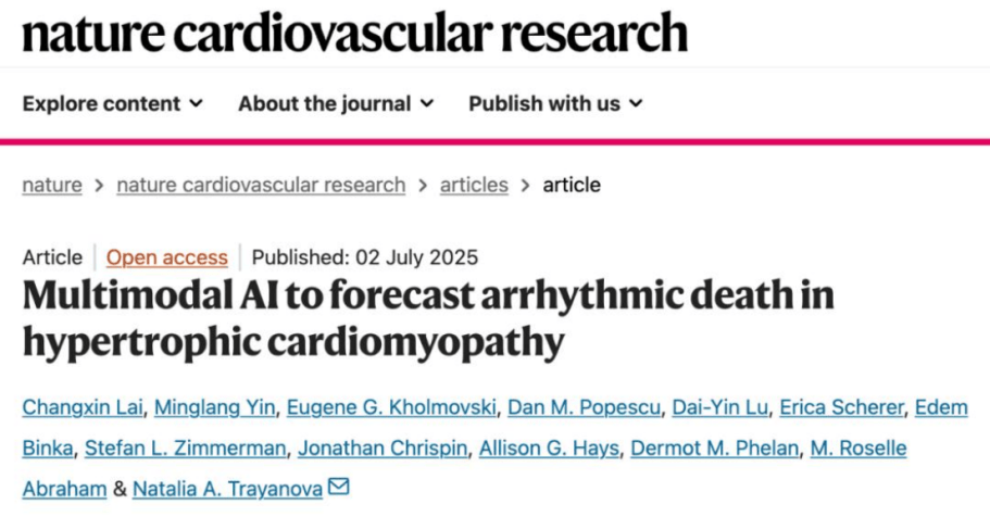 当前临床实践中,肥厚型心肌病的诊断准确率仅50%左右,这一局限性导致医生在评估患者是否需要植入心脏除颤器等预防性治疗时面临重大决策困境。2025年7月2日,约翰·霍普金斯大学的研究团队在Nature Cardiovascular Research 发表题为"Multimodal AI to forecast arrhythmic death in hypertrophic cardiomyopathy"的研究。