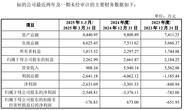 2023年、2024年、2025年1至3月,东进航科营业收入分别为5,562.88万元、5,940.14万元、908.34万元,净利润分别为-848.94万元、-3,301.33万元、-2,631.69万元,归属于母公司股东的净利润分别为-743.06万元、-3,376.11万元、-2,548.81万元,归属于母公司股东的扣除非经常性损益后的净利润分别为-651.93万元、673.00万元、-176.83万元。