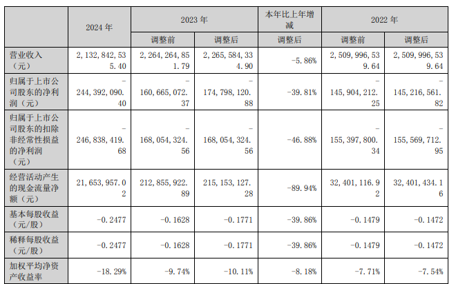 金浦钛业连续3年1期亏损。2024年,公司实现营业收入21.33亿元,同比下滑5.86%;归属于上市公司股东的净利润-2.44亿元,同比下滑39.81%,2022年与2023年同期为-1.45亿元、-1.75亿元;归属于上市公司股东的扣非净利润-2.47亿元,同比下滑46.88%,2022年与2023年同期为-1.56亿元、-1.68亿元;经营活动产生的现金流量净额为2165.40万元。