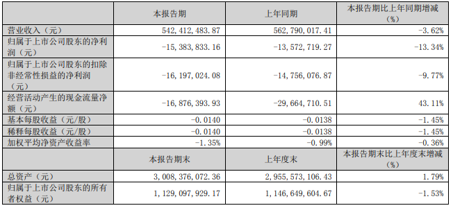2025年一季度,公司营业收入为5.42亿元,同比下滑3.62%;归属于上市公司股东的净利润为-1538.38万元,同比下滑13.34%;归属于上市公司股东的扣非归母净利润为-1619.70万元,同比下滑9.77%;经营现金流净额为-1687.64万元。