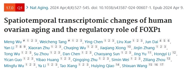 2024年,一篇发表于《Nature Aging》名为《Spatiotemporal transcriptomic changes of human ovarian aging and the regulatory role of FOXP1》的文章,揭示了细胞衰老与卵巢衰老的关系。【1】