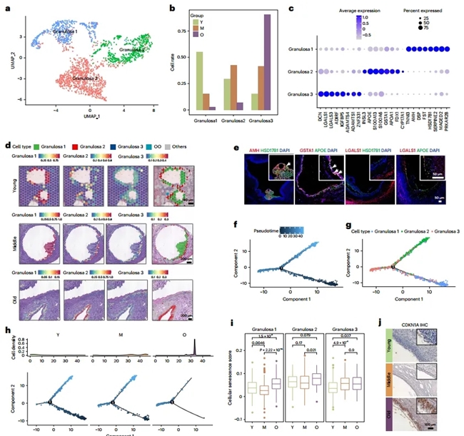 此外,为进一步探究细胞在卵巢衰老过程中的分类及变化,研究人员通过UMAP分析将卵巢颗粒细胞分为三种亚型,并使用亚型特异性标记验证这些细胞不同的空间分布。实验结果发现,早期年轻组亚型1主要分布在中青年卵巢中,而老年样本中的卵巢颗粒细胞主要分布在老年组亚型3的末端,意味在卵巢衰老过程中卵巢颗粒细胞发生了GeneSwitch。这种成分的转变可能代表着功能性卵巢颗粒细胞的减少和衰老卵巢中凋亡细胞的潜在增加。