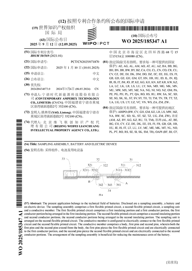 证券之星消息,根据企查查数据显示宁德时代(300750)公布了一项国际专利申请,专利名为“采样组件、电池及用电设备”,专利申请号为PCT/CN2025/071870,国际公布日为2025年9月11日。