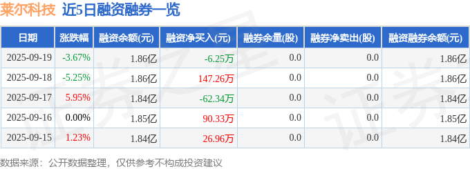 证券之星消息,截至2025年9月19日收盘,莱尔科技(688683)报收于34.95元,下跌3.67%,换手率1.49%,成交量2.31万手,成交额8155.56万元。