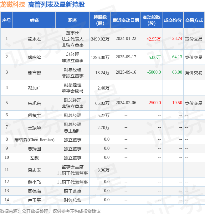 龙磁科技近半年内的董监高及核心技术人员增减持详情如下: