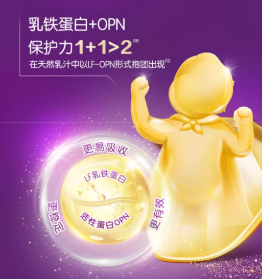 在保护力提升方面,205mg/100g[1]高量乳铁蛋白+活性蛋白OPN模拟母乳抱团出现的结构[2],有效减少25%呼吸系统和肚肚不适[3],形成内保护、外防御的守护屏障。在肠道吸收层面,菁护添加10倍[4]活性益生菌和55倍[5]双重益生元组合,能有效调节肠道菌群平衡,形成肠道“良性循环”,有效降低宝宝腹泻、便秘发生率。