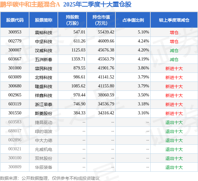 鹏华碳中和主题混合A的前十大重仓股如下: