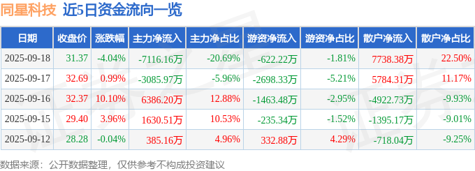 证券之星消息,截至2025年9月18日收盘,同星科技(301252)报收于31.37元,下跌4.04%,换手率22.72%,成交量10.75万手,成交额3.44亿元。