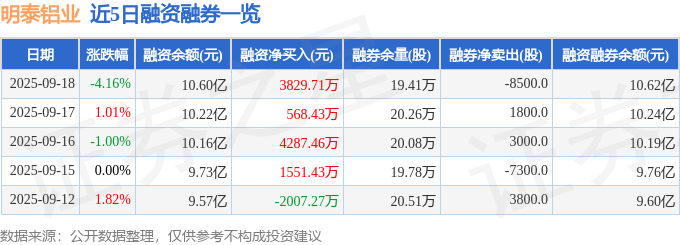 证券之星消息,截至2025年9月18日收盘,明泰铝业(601677)报收于13.37元,下跌4.16%,换手率5.01%,成交量61.05万手,成交额8.26亿元。