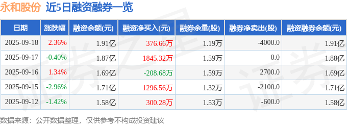 永和股份融资融券信息显示,融资方面,当日融资买入3731.5万元,融资偿还3354.84万元,融资净买入376.66万元。融券方面,融券卖出0.0股,融券偿还4000.0股,融券余量1.19万股,融券余额33.05万元。融资融券余额1.91亿元。
