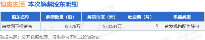 证券之星消息,根据市场公开信息整理,恒鑫生活(301501)于9月19日将有190.76万股限售股份解禁,为公司首发机构配售股份,占公司总股本1.29%。(本次数据根据历史公告整理得出,实际情况以上市公司公告为准)本次解禁后,公司还有1.11亿股限售股份,占总股本75.0%。具体如下图所示: